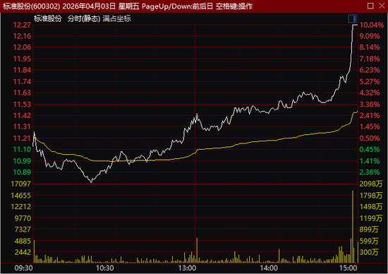 标准股份(600302)尾盘突然直线拉升,1分钟封住涨停。