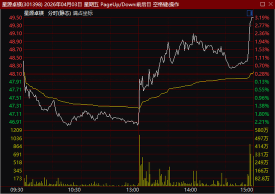 星源卓镁尾盘亦直线拉升,收盘大涨3.19%。