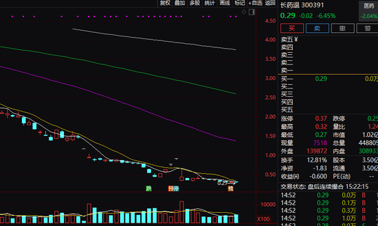 长药退今天股价大跌6.45%,盘中最低至0.27元/股,创出该股历史新低。对于公司股票被终止上市的原因,公告显示,是根据《行政处罚决定书》载明的事实,公司2021年至2023年年度报告信息披露存在虚假记载。